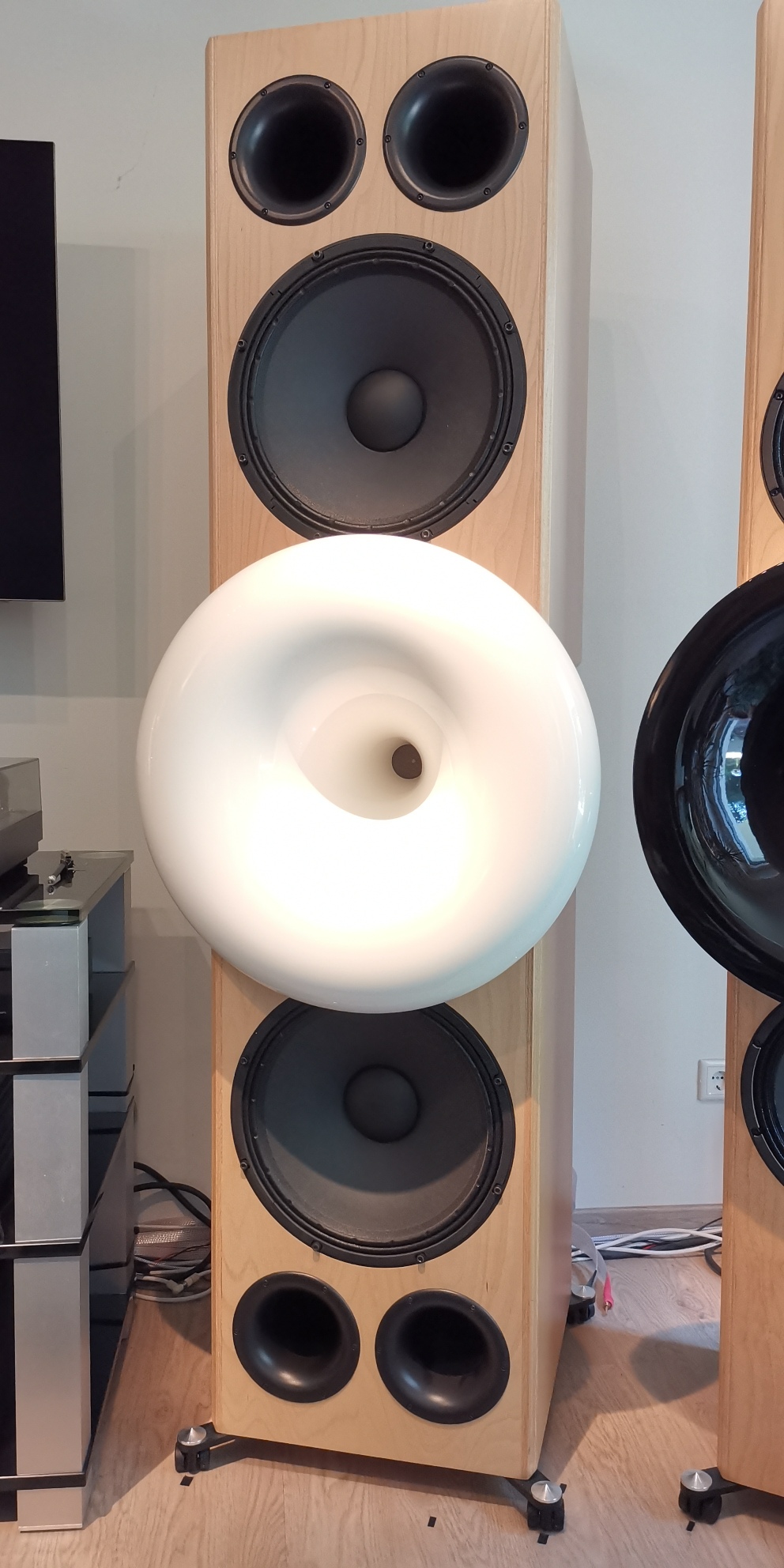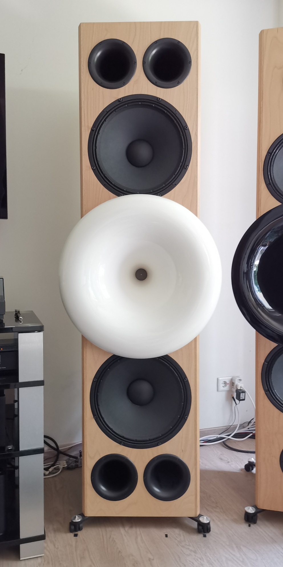Die 60cm großen Kugelwellenhörner bestehen aus einem sehr starken, schweren und resonanzarmen Glasfasergemisch, klingen äußerst dynamisch bei extrem hoher Auflösung!